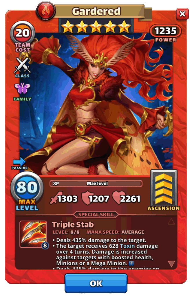 - Role: Reaper | DoT Attacker (Toxin, extra vs Boosted HP/Minions) | Debuffer (Deep Sleep: Mana & Attack Block)