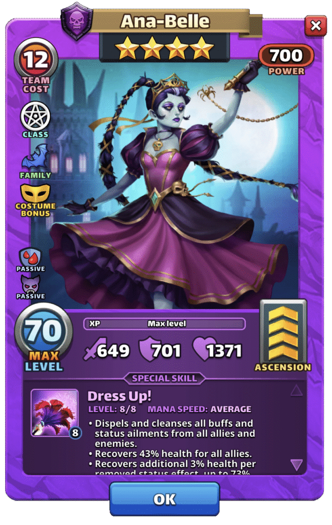 - Ana-Belle (Costume: Baroness of Dust) – Epic Dark Sorcerer, versatile support with healing, dispels, and cleanses.