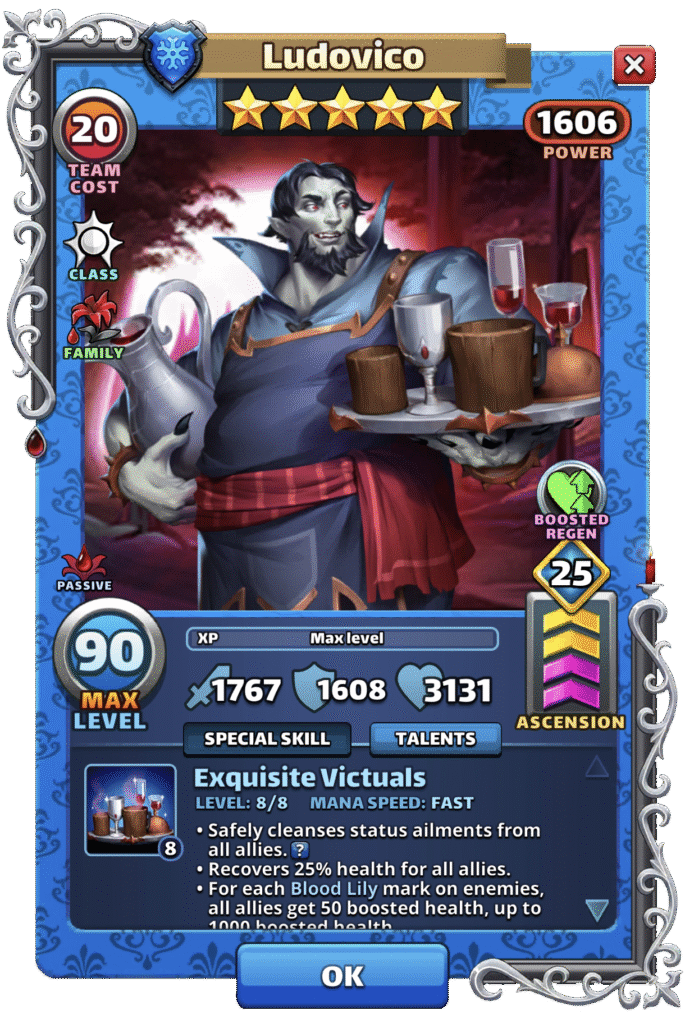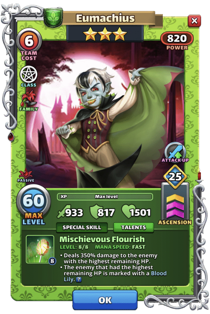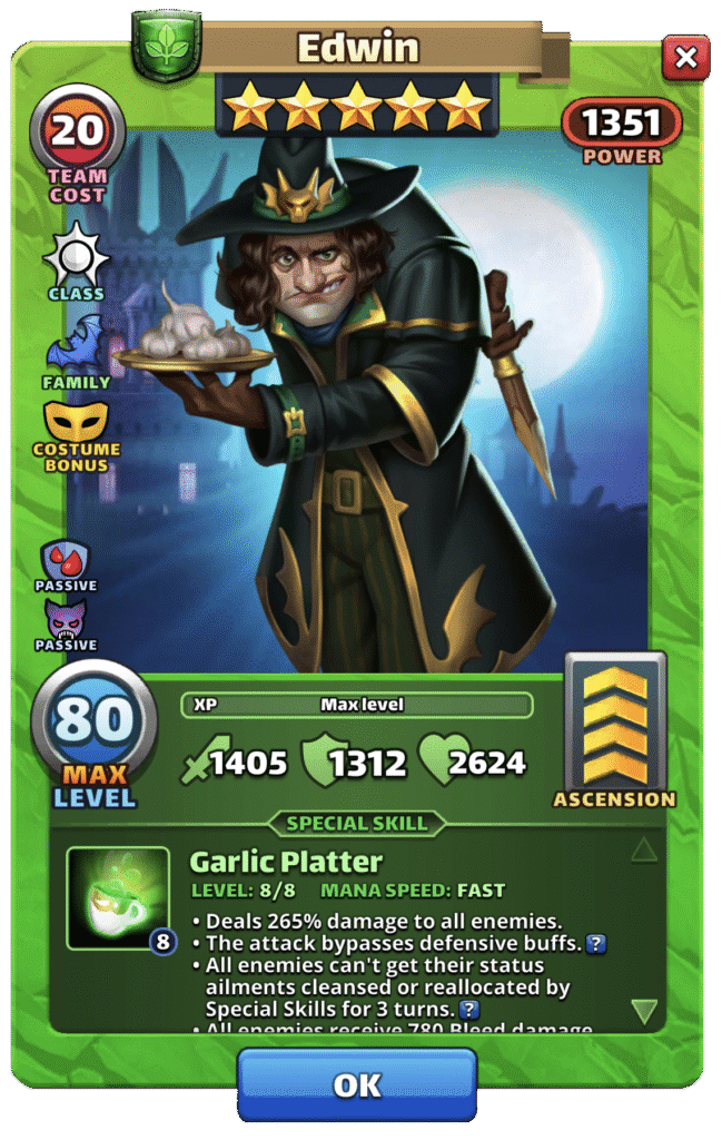 - Edwin (Costume: Backstabbing Butler) – Legendary Nature Cleric, fast hitter, bypasses defense, debuffs, and applies DoT.