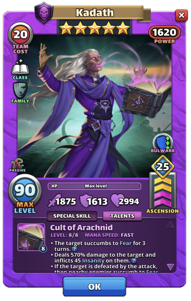 This effect is devastating—like an upgraded version of Greed that turns enemies against themselves. While Kadath suffers from Insanity as a balancing drawback, his Fear mechanic could completely reshape PvP and Raid strategies.
