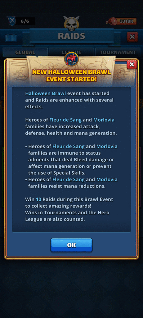 The Halloween Brawl takes the traditional Raid Brawl format and injects it with spooky seasonal flavor. This special event heavily favors heroes from the Morlovia and Fleur De Sang families, making them absolute monsters on the battlefield.