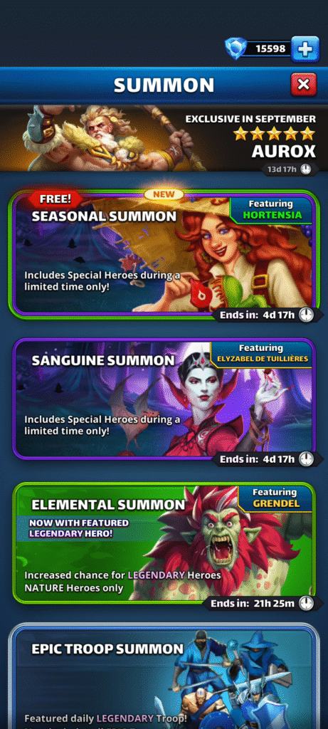 💡 Pro Tip: Save your gems and maximize your free pulls through Sanguine Spirits. Holding onto your Epic Summon Tokens for October could also give you better value.