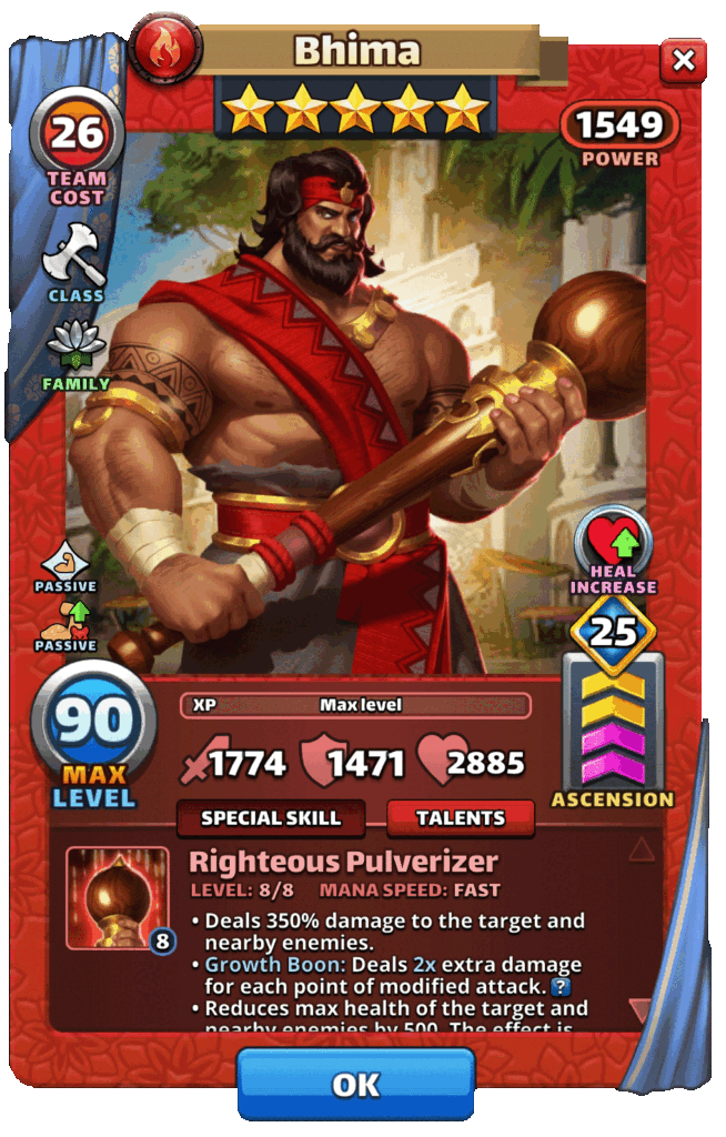 Bhima brings raw strength to the frontlines. He works as a Reaper, a Growth Buffer, a Max Health Reducer, and an Accuracy Debuffer. He is a high-impact attacker who can weaken enemies while dealing significant damage, effective in both offensive and defensive compositions.