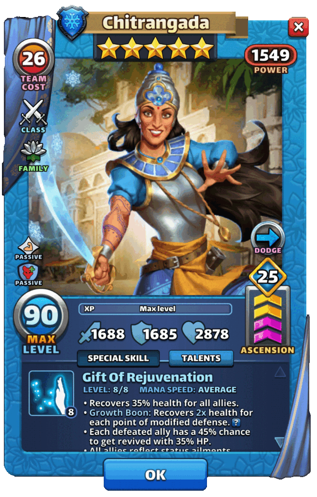 Chitrangada shines in a support role, bringing strong healing, growth buffs, revival abilities, and ailment reflection. Her utility makes her a powerful backbone in both defensive and offensive setups.