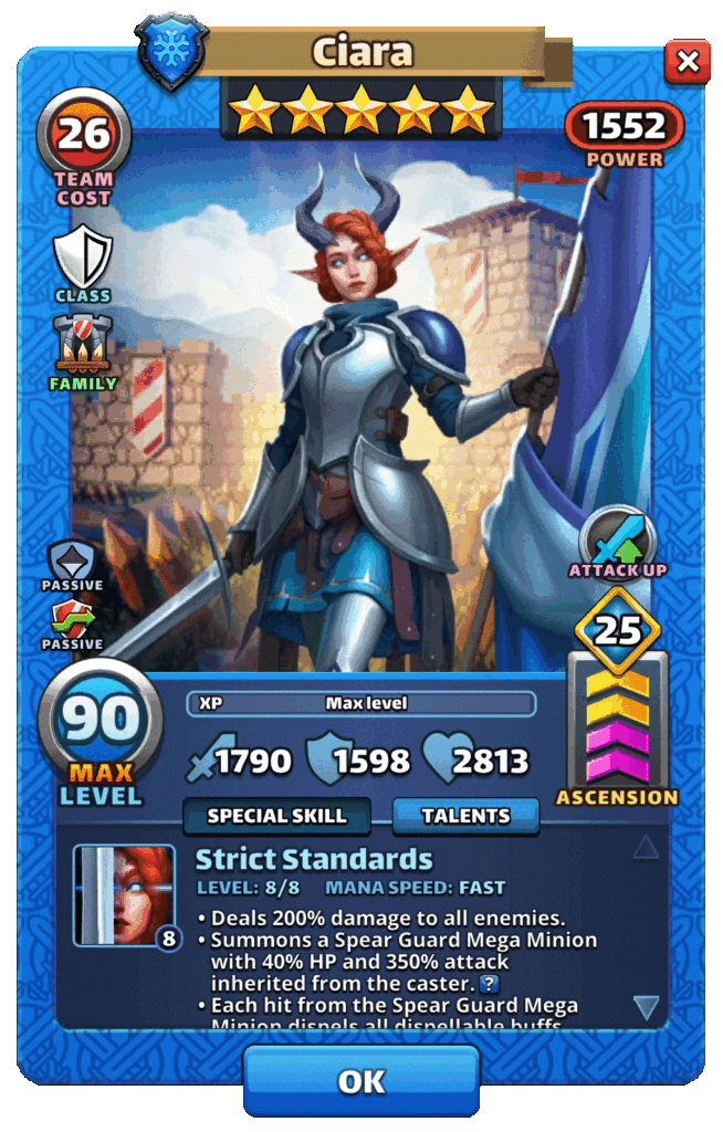 Ciara is a formidable force on the battlefield. Her skills place her in the role of a Damage Dealer, a Mega Minion Summoner, and a Dispeller. She thrives as a versatile attacker, making her effective in a wide range of combat scenarios.