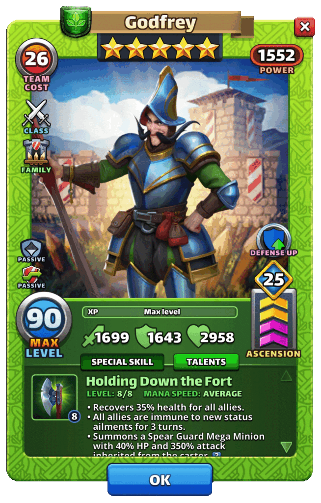Godfrey stands out with a strong support-focused toolkit. He excels as a Healer, Buffer, Mega Minion Summoner, and a Dispeller. His hybrid functionality makes him a reliable offensive healer who performs well in both attack and defense strategies.
